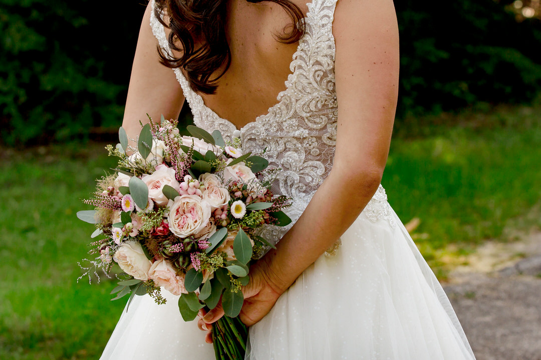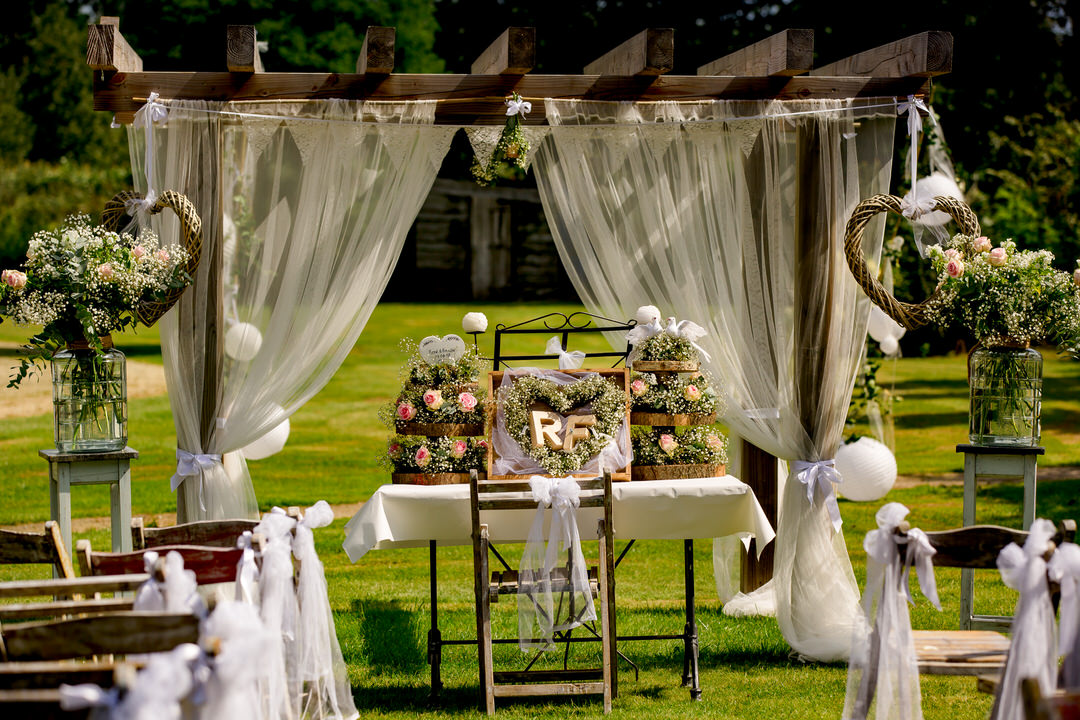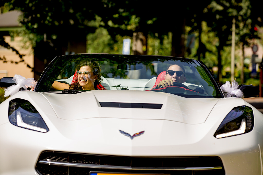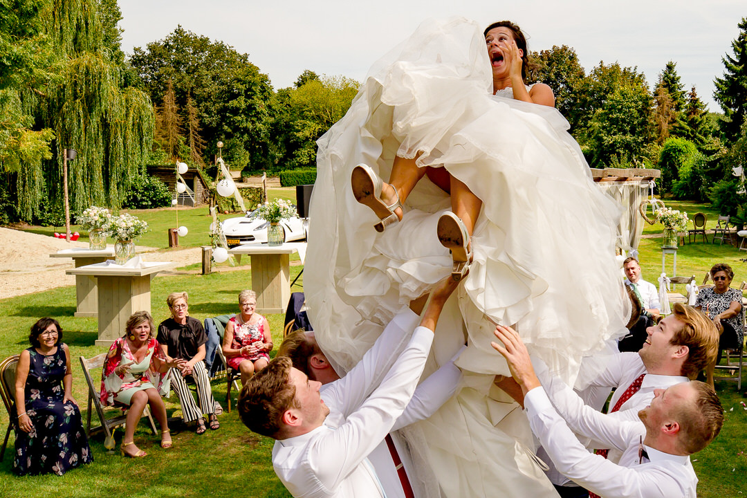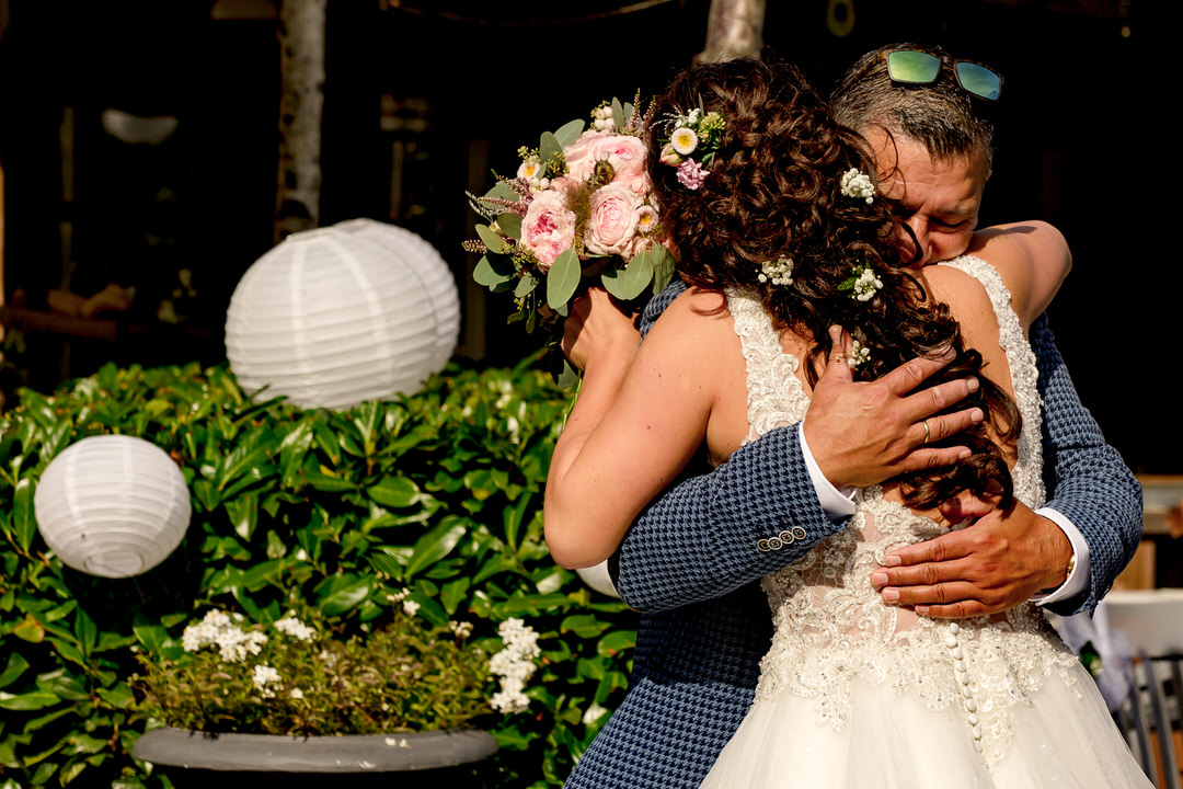 De prachtige buiten ceremonie bij Thematuin de Heihut was tot in de puntjes verzorgd. Echt aan alles was gedacht, van de versierde ceremonietoog tot aan de muziek. De warmte mocht de pret niet drukken. Na een lange borrel en de groepsfoto’s, trouwden het bruidspaar ook voor de kerk. Elk stoeltje werd benut en er stonden zelfs mensen buiten om de mooie kerk ceremonie bij te wonen.